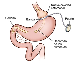 Se coloca una banda ajustable alrededor de la parte superior del estómago. Esta banda es como un anillo. Crea una cavidad o bolsa pequeña en la parte superior del estómago. En esa bolsa caben solo unas pocas cucharadas de comida. La comida pasa lentamente a través de una abertura estrecha en la parte inferior del estómago. Esto hace que se sienta lleno durante más tiempo. El tamaño de la banda se ajusta mediante un puerto de acceso bajo la piel. Ese puerto le facilita a su proveedor de atención médica un medio para insertar una aguja. La aguja se usa para agregar líquido a la banda o quitárselo. Esto se hace para aumentar o disminuir el tamaño de la abertura. El ajuste del tamaño de la abertura de la banda determina la rapidez con la que los alimentos salen de la cavidad.