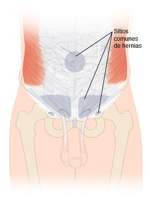 Una hernia puede ocurrir cuando hay una debilidad o un defecto en la pared del abdomen o la ingle. El intestino o los tejidos cercanos pueden moverse desde su ubicación habitual y empujar la debilidad en la pared. Esto puede causar un bulto (hernia) que se puede ver o sentir.