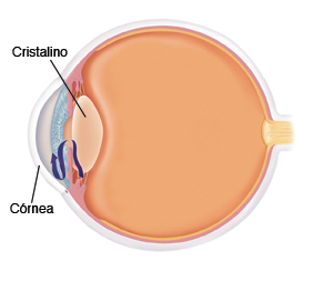 El ojo es un globo lleno de líquido con un cristalino cerca del frente. En el fondo hay una membrana sensible a la luz (retina). El nervio óptico transporta las señales de luz desde la retina hasta el cerebro. Le permite ver. Dentro del ojo se fabrica líquido intraocular constantemente. El exceso de este líquido se va por el torrente sanguíneo.