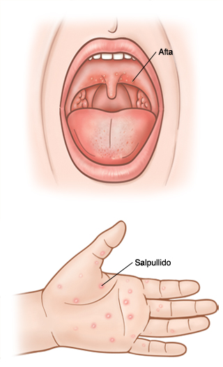 La enfermedad de manos, pies y boca, también conocida como fiebre aftosa humana, es producida por un virus. Suele aparecer en niños pequeños. El virus produce unas pequeñas úlceras en la garganta, los labios, las mejillas, las encías y la lengua. Pueden aparecer pequeñas ampollas o manchas rojas en las palmas de las manos, la zona del pañal y las plantas de los pies. Por lo general, el niño tiene fiebre baja y falta de apetito. La enfermedad de manos, pies y boca no es grave y suele desaparecer en 1 o 2 semanas. Pero las llagas dolorosas en la boca pueden impedir que su hijo coma o beba.