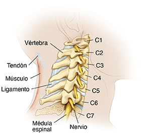 Si se aprende las partes del cuello, podrá entender mejor su problema. Los huesos del cuello se denominan vértebras cervicales, comúnmente identificadas como C1 a C7.Juntas forman una columna ósea llamada columna vertebral. Las vértebras también protegen la médula espinal, la cual es una vía para que los mensajes lleguen al cerebro. Alrededor de la columna vertebral hay tejidos blandos como músculos, tendones y nervios.