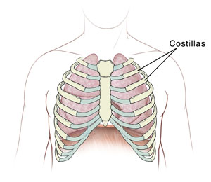 Una contusión de costillas es una magulladura en una o más costillas. Puede causar dolor, sensibilidad, hinchazón y una decoloración purpúrea. Puede haber un dolor agudo con cada respiración. Una contusión de costillas toma de uno a varios días, o hasta varias semanas en sanar. Una fractura de costilla (quebramiento del hueso) puede provocar los mismos síntomas que una contusión de costillas. Una rajadura pequeña podría no verse en una radiografía del tórax común.