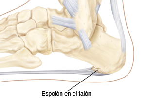 Un espolón calcáneo es un crecimiento excesivo de hueso (depósito de calcio) donde la fascia plantar se une al hueso del talón. En general, el espolón calcáneo en sí no causa dolor. Pero el espolón calcáneo podría ser un signo de fascitis plantar que podría causar dolor en el pie.