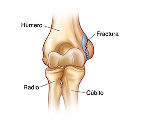 Su hijo tiene una fractura (hueso roto) en el codo. Por lo general, la fractura de codo causa dolor, hinchazón y moretones. También es posible que el codo tenga una forma extraña. La articulación del codo tiene 3 huesos. El húmero es el hueso de la parte superior del brazo y se conecta con el radio y el cúbito, los 2 huesos de la parte inferior del brazo. La fractura de codo puede ser en cualquiera de estos huesos, pero la más común es en el húmero.