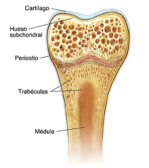 Los huesos se componen de diferentes tipos de tejidos. El periostio es una capa delgada de tejido que cubre la mayor parte de un hueso. Allí donde se unen los huesos, suele haber una capa de cartílago en los extremos. El hueso en ese lugar se llama subcondral. En el centro del hueso hay una zona llamada médula. Contiene la médula ósea y varios tabiques de tejido fibroso llamados trabéculas.