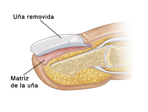 El lecho ungueal (el tejido debajo de la uña) está húmeda, suave y sensible. Protéjase el lecho ungueal por primera vez De 7 a 10 días hasta que se seque y se endurezca. Mantenerlo cubierto con un antiadherente apósito o vendaje adhesivo hasta ese momento.