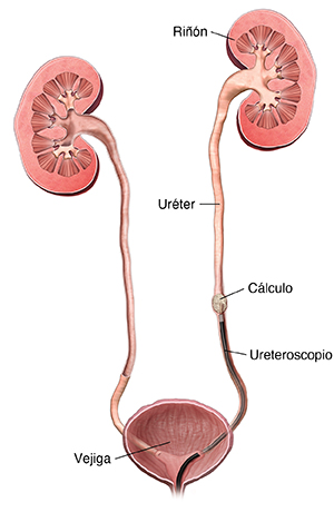 En la extracción de cálculos renales mediante ureteroscopia, se extrae un pequeño cálculo en el uréter. Esto se hace sin una incisión. El uréter es el conducto por el que pasa la orina desde el riñón a la vejiga. El proveedor de atención médica coloca un tubo de observación (ureteroscopio) en el uréter. A través del tubo se inserta una pequeña canastilla de alambre con la cual se extrae el cálculo. En algunos casos, se utiliza un láser o un dispositivo mecánico para romper el cálculo. Es posible que se deje un tubo blando en el uréter por poco tiempo para drenar la orina.