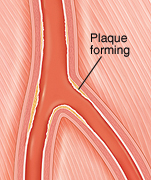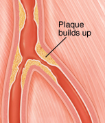 Peripheral arteries deliver oxygen-rich blood to the tissues outside the heart. As you age, your arteries become stiffer and thicker. Things such as smoking and high cholesterol can also damage the artery lining. This allows a buildup of fat and other materials (plaque) to form within the artery walls. The buildup of plaque narrows the space inside the artery and sometimes blocks blood flow. Peripheral arterial disease (PAD) happens when blood flow through the arteries is reduced because of plaque buildup. It often happens in the legs and feet. But it can also happen elsewhere in the body. It can lead to stroke if this buildup happens in the large artery in the neck (carotid artery).