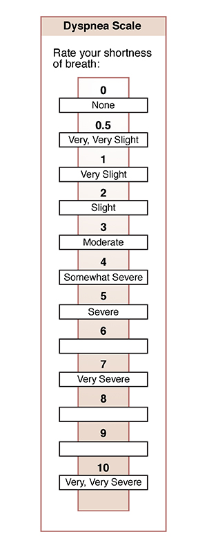 Dyspnea is shortness of breath, or breathing discomfort. It's a common symptom that affects many people with lung disease. The Dyspnea Scale measures this shortness of breath. While you exercise, think about how short of breath you feel. Be aware of how hard you are working to breathe. Then pick the number and words on the scale that best shows how you feel at that time. If your shortness of breath is very slight, you’re at level 1. If you feel severely short of breath, you’re at level 5. If you can’t breathe at all, you’re at level 10. Use this scale to help pace your workout. Try to keep your effort level around 3 to 5 on the scale, unless you are advised otherwise.